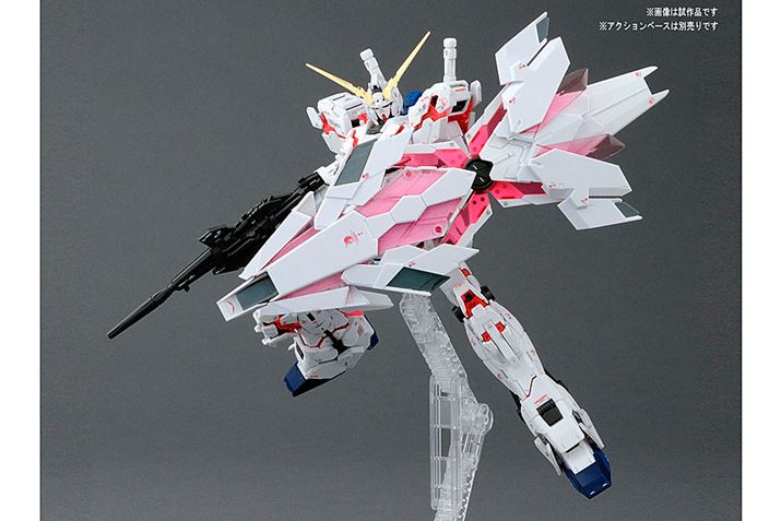 同製品は、最大の特徴である頭部アンテナも精密に再現。選択式で可動1種と固定2種が付属する。また、「獅子の鬣(たてがみ)」と呼ばれる「アームド・アーマーXC」を新規造形で再現。デストロイモード時に露出するサイコ・フレームに一部クリアパーツを採用している。さらに、「アームド・アーマーDE」は新規追加パーツで再現。展開ギミック部分にロック機構を搭載し、ユニコーンモード形態での安定性が向上しているという。