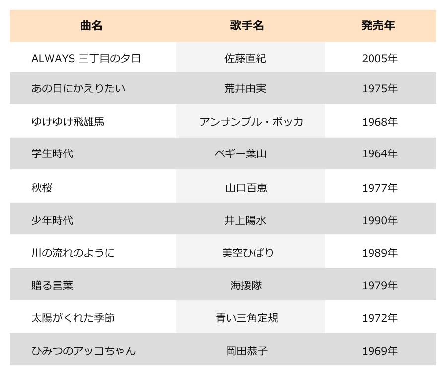 では収録曲のご紹介です。曲名、歌手、発売年でまとめました。