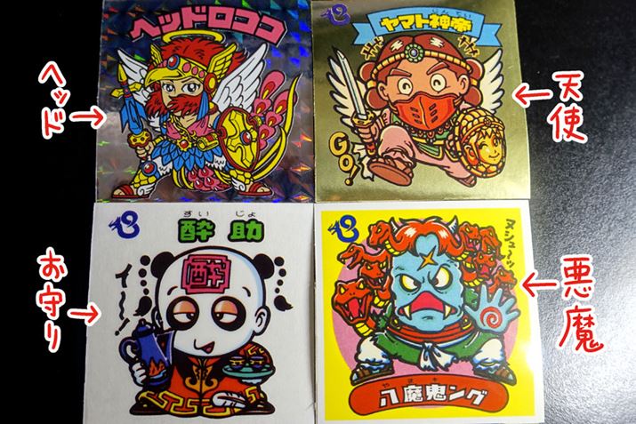 本原 天使、悪魔、お守り、ヘッドとカテゴリー分けされていますが、キャラクターを知らなかったとしても、シールの素材を見れば直感的に当たりなのかハズレなのかわかるじゃないですか。