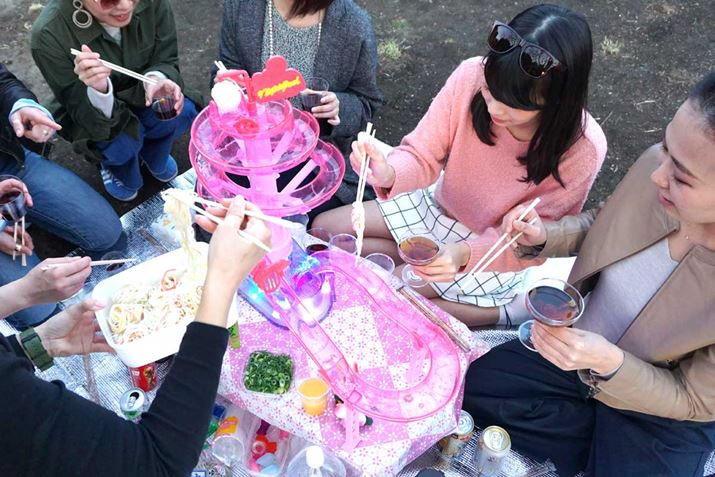ところで、現在の季節は春(正確には初春)です。さすがに野外流しそうめんをするには雰囲気が足りないかも、と考えた結果、 “夜桜×流しそうめん”パーティーというコンセプトを思いつきました。桜の花びらがLEDできらきら光ったらキレイでいいかも。ドキドキしながら編集部の女子にパーティーの誘いをかけてみたところ、なんと全部で7名も集まってくれました。