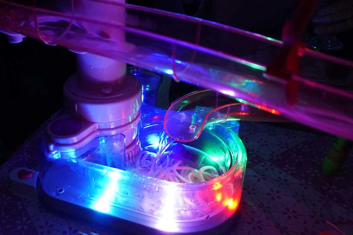 ウォータースライダー型流しそうめんマシン「ビッグストリーム そうめんスライダー ナイトプール」(タカラトミーアーツ)。価格は8,980円(税別)。プールの底に「ライティングユニット」をセットすることで光る仕組み