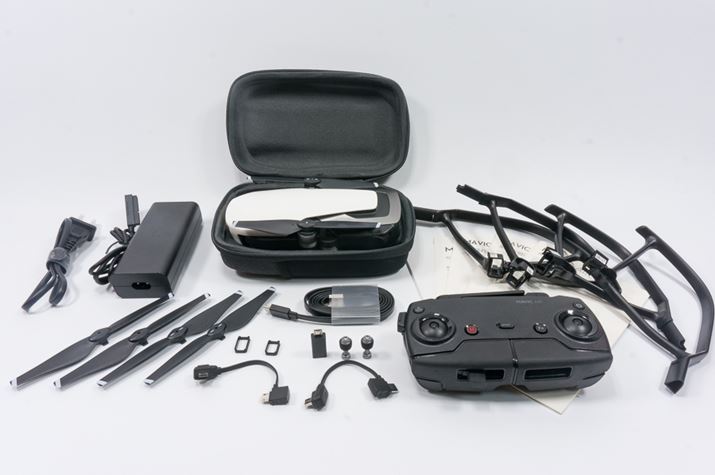「Mavic Air」には、予備バッテリーや専用トラベルバッグなどが付属するセット「Fly More コンボ」がありますが、本体のみでもセット内容は豊富で予備パーツがしっかり揃っています。プロペラやコントローラーのスティックなど壊したりなくしたりしやすい部品に予備があるのはポイント高めです。