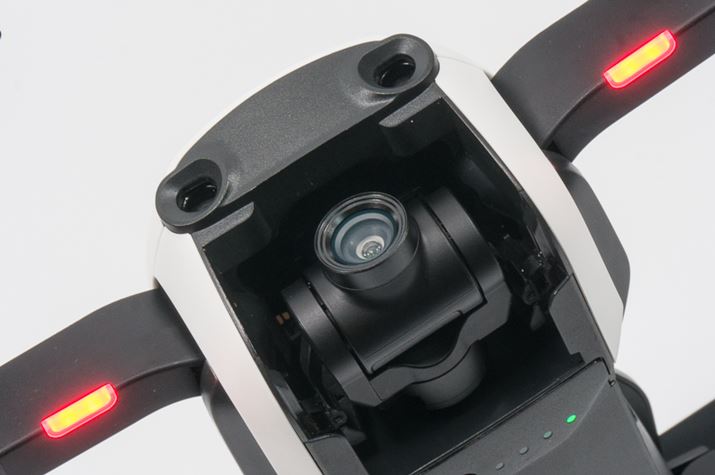 前方下部にあるカメラは、上と背面、左右がボディに包まれている構造のため、衝突や墜落の際に破損しづらくなっています。また、一見すると本体に直接カメラがマウントされているようですが、実際はしっかりと3軸ジンバルの先に装着されています。