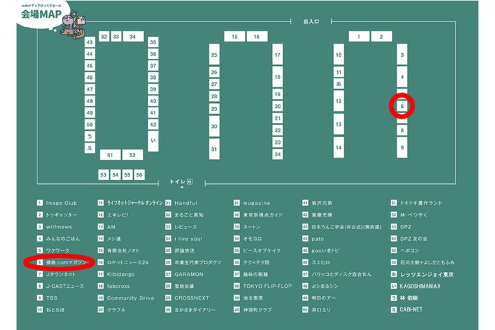 ↓会場の配置図はこちら。価格.comマガジンのスペースは赤く囲った「6番」です。
