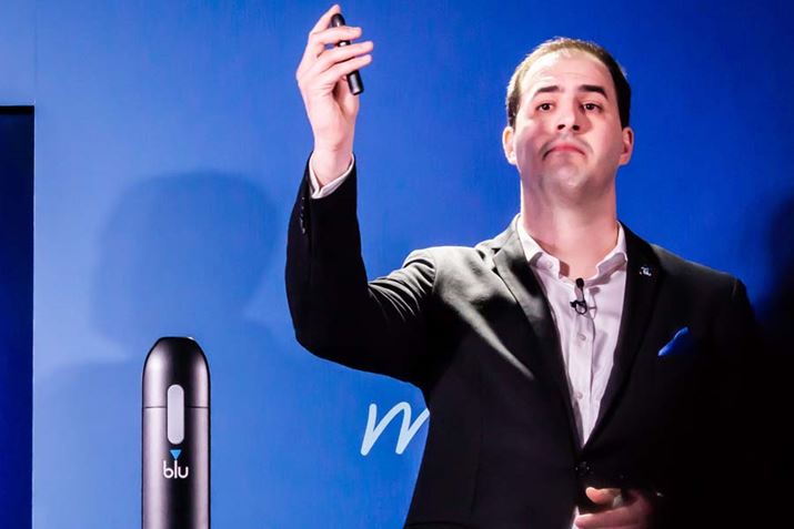 「myblu」を高々と掲げる、ITJ マーケティング本部長のヤオコビッチ・トーマス氏。「日本のタバコ環境は、健康志向の高まり、副流煙の問題や喫煙場所の制限により、喫煙者にとって非常に厳しい環境。そこでこの世界で3,000万人が楽しんでいるVAPEを“SOMETHING BETTER”として提供したいと思います。アイコスなどの加熱式タバコとは別物です。ライバル視もしていません。喫煙者のみにとどまらず、新しい市場を開拓するために我々はmybluをリリースするのです」と語った