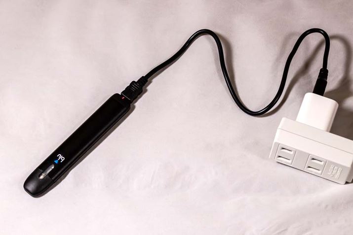 まず付属のmicroUSBケーブルで本体を充電する。20分でフル充電が可能だ。赤いLEDが光れば充電中。フレーバーポッドは付けていても、いなくても充電可能