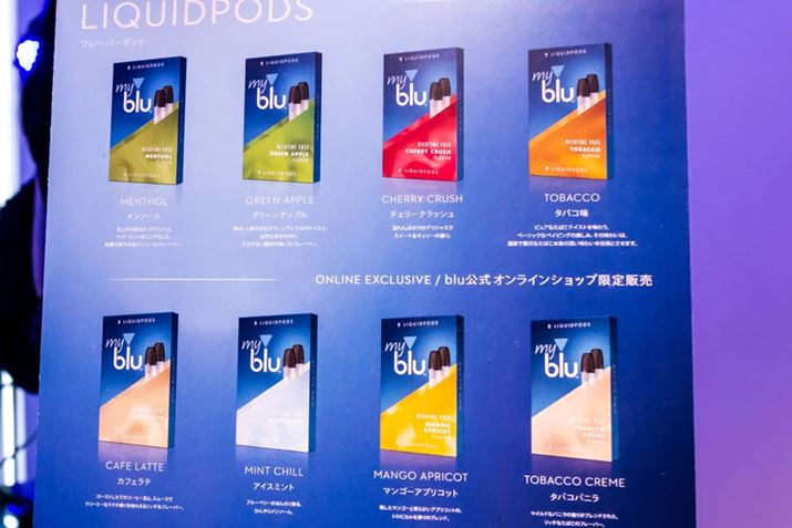 フレーバーの種類はスターターキット付属のメンソールのほか、グリーンアップル、チェリークラッシュ、タバコ味、カフェラテ※、アイスミント※、マンゴーアプリコット※、タバコバニラの8種類(※印はblu公式オンラインショップ限定)