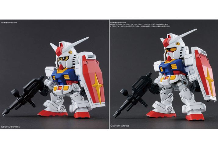 スターターキットである「SDガンダム クロスシルエット RX-78-2 ガンダム & クロスシルエットフレーム セット」には、2種類のサイズのフレームが同梱。「RX-78-2 ガンダム」の低頭身SD(左)と高頭身SD(右)が組み立てられる