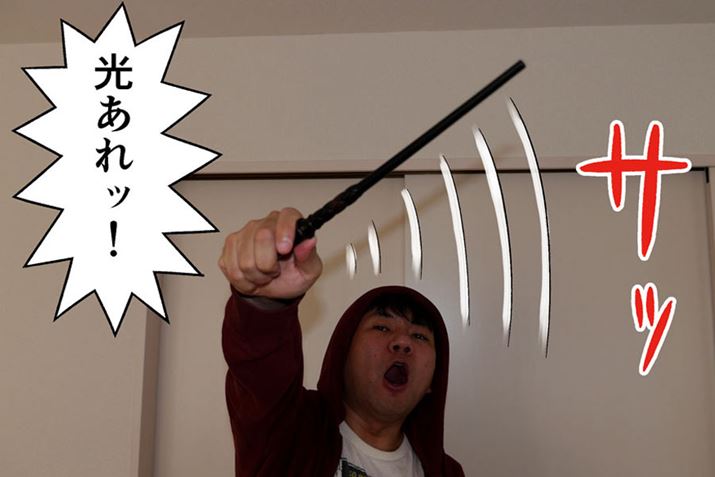 杖の先から赤外線が発射されるので、杖を振り終わったときに、先端が目的とする家電の赤外線受信機のほうを向いていなくちゃならないんですが……。