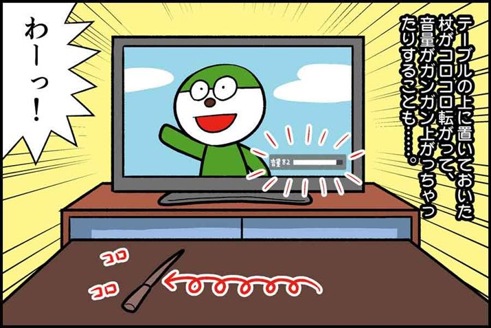 リモコンが見当たらなくても、この杖をシャッと振るだけでテレビを操作できるということ。