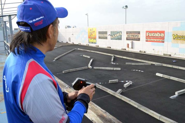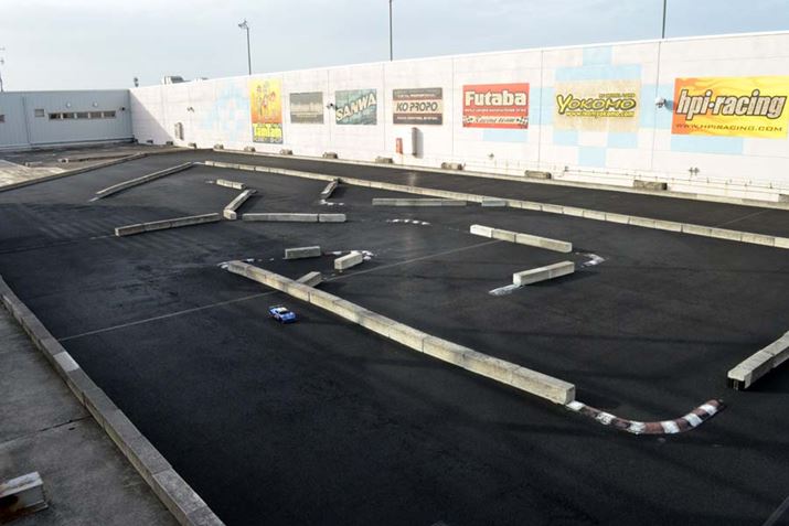 これがRC用のサーキット。サイズ感としては実車ならミニサーキットという感じですが、クランクの部分が多く、かなりテクニカルなレイアウトだと感じました