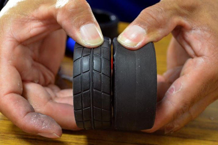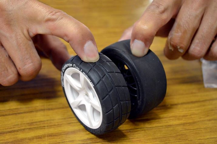 右のタイヤがノーマル、左がややハイグリップなタイヤです。ノーマルは軟らかすぎる感触なので、レースには不向きでしょう