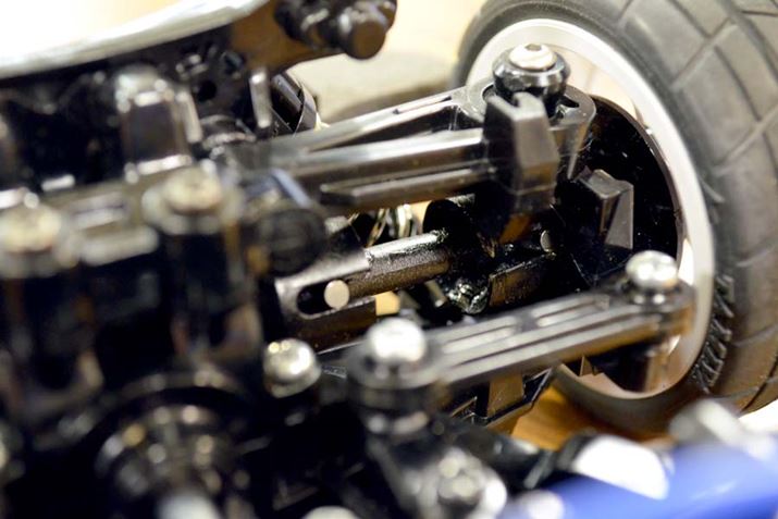 金属製の強化パーツを組み込んだ状態。実際のクルマもRCカーも、パーツの強度はコストとの兼ね合いで決まります