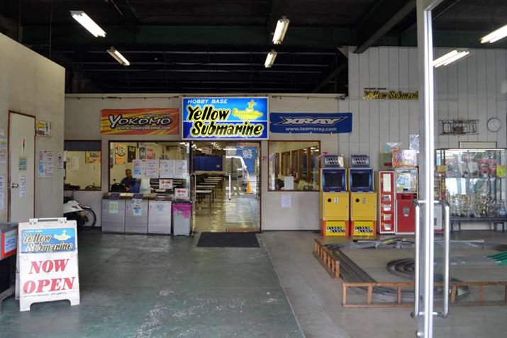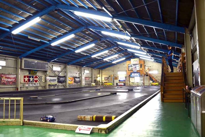 イエローサブマリン戸田美女木店のRC用サーキットは屋内。ここでもレースが開催されるので、実戦向きの練習ができます。ハイエンド機種を自在に操るベテランさんの姿も