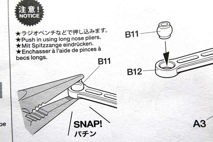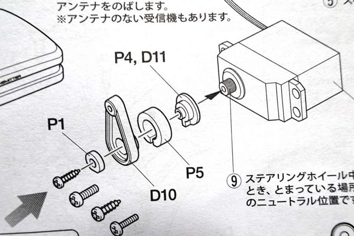 お店の人に指摘され、ようやく最大の問題が解消。組み立て時に「P4」もしくは「D11」のいずれかだけを付けるはずが、両方とも付けてしまったことで、ステアリングサーボの軸が大きくブレていたのでした