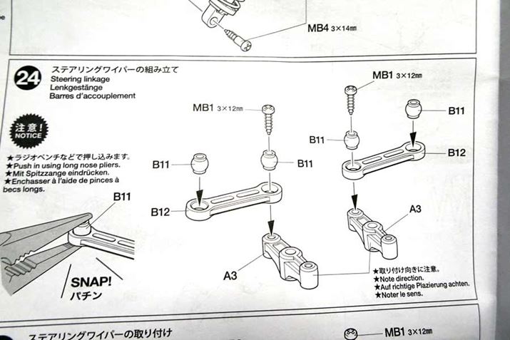 このパーツも新橋のタミヤショップで買ったときから弱いと聞いていたので、強化品を購入していたのですが、実際にはどの程度弱いのか実感するためにも、あえてノーマルパーツのまま組み立てていたのです。案の定、すぐに折れてしまいました。