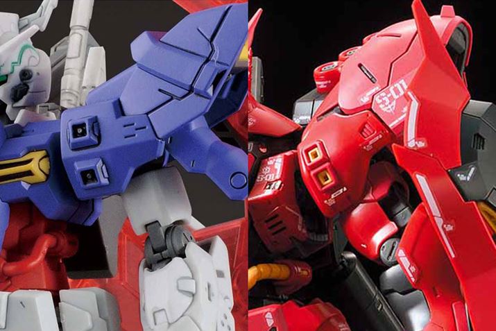 左が「HGUC 1/144 ムーンガンダム」で、右が「RG 1/144 サザビー」。外側に跳ね上がった独特な肩形状やディテールは確かに似ている。「ムーンガンダム」が「サザビー」のプロトタイプのひとつ「バルギル」の意匠を受け継いでいるのが理由だ