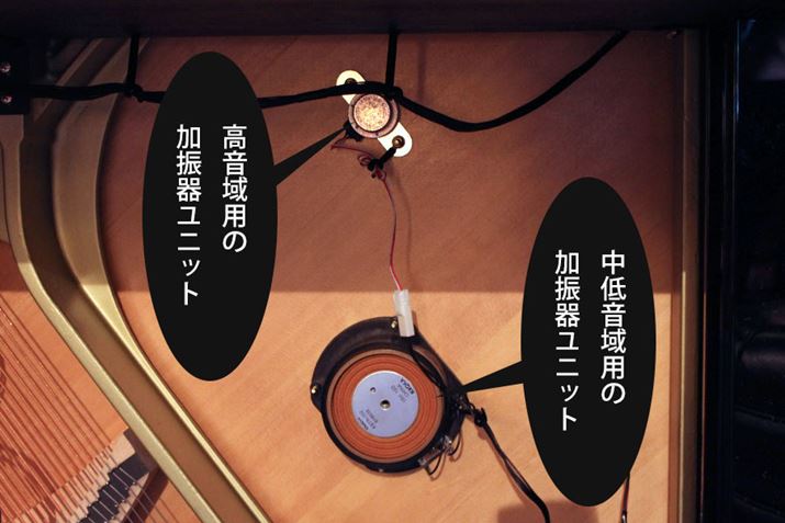 ピアノの響板を、スピーカーシステムとして応用した「響板スピーカー」が大きな特徴。内部に加振器ユニットを装備する(緑マルの部分)。後述するが、モデルによってユニットの配置位置が異なっているそうだ