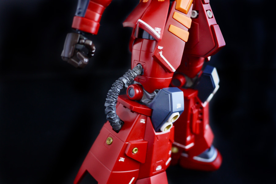 ザク単体としてもとてもカッコいいガンプラになっています。この赤い色がシャア専用の赤とは異なり、深く黒っぽい色合いなのがとても映えるんですよね。ゴールドのバーニアパーツはかなり細かいので、扱いに注意が必要です。