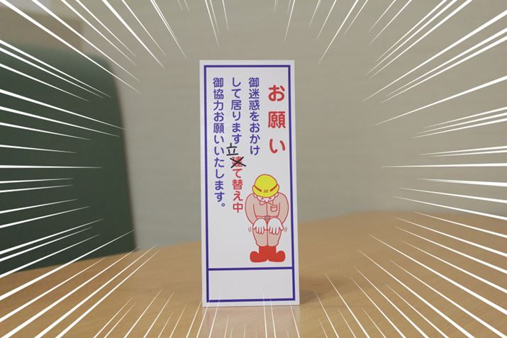工事現場の看板をもじった、「立て替え中」というカードをこっそり立てかけてみました。