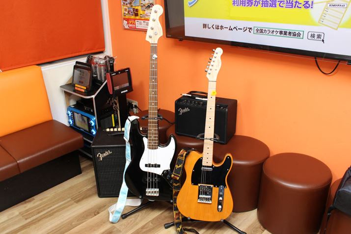 店舗の受付カウンターにギターとベース! 通常のカラオケルーム利用の受付時に、希望すれば無料で貸してくれます