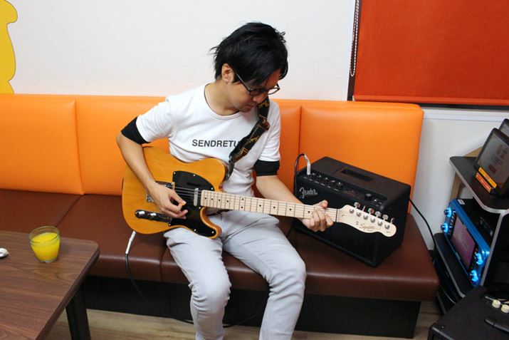 会社帰りにふらりと立ち寄った風のカズー藤田。実際、カラオケルームに入った5秒後には、ギターとアンプをつないで練習モードになっていました