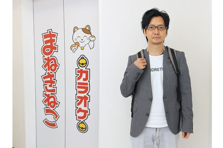 仕事帰りの身軽な格好で「まねきねこ」を訪れたカズー藤田。カカクコム入社前は某大手楽器チェーン店に勤務しており、アンプ/エフェクター製品の全店統括MD経験を持つスペシャリストです。元ドラマーで今はボーカルとしても活動中。hideとさだまさしの熱烈ファン