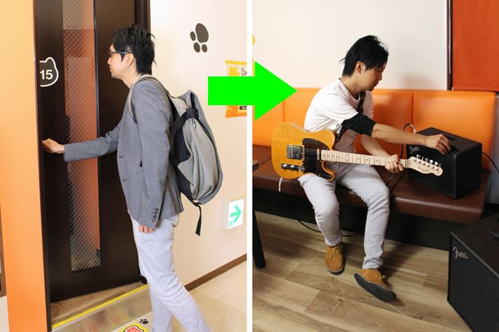 というわけで今回は、ギターやエフェクターが大好きなカカクコム社員・藤田和久(通称:カズー藤田)を連れて、「まねきねこ・池袋東口店」に行ってきました! 実際に「まねきねこ」でギター練習して実感したメリットを、順番にご紹介していきましょう。
