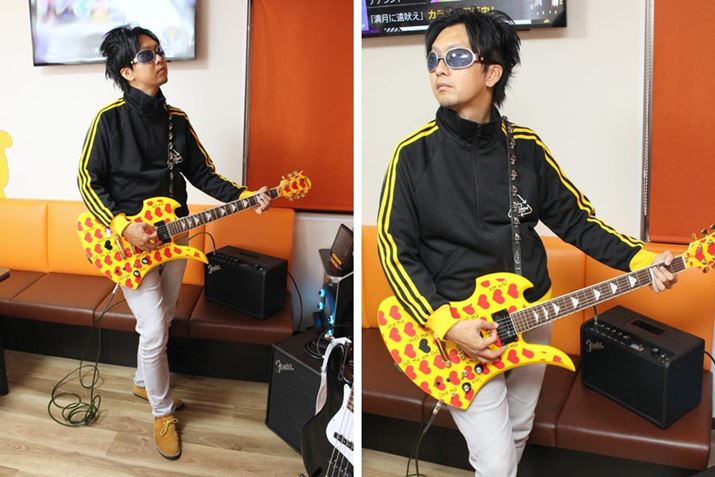 さっそく大好きなhideさんになりきるカズー藤田。カラオケルームだから全然恥ずかしくないし、誰にも迷惑かけません!(※注:画像にあるコスプレグッズはギター含め全て藤田の私物です。「まねきねこ」で貸し出しはしていません)