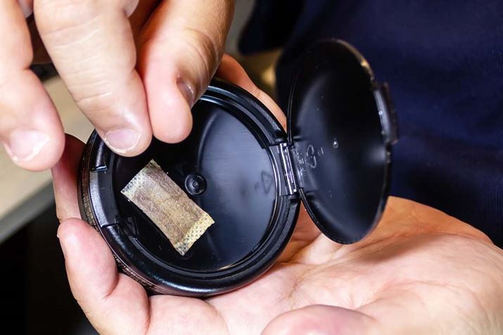 JTが発売している「ゼロスタイル・スヌース・レギュラー」(ニコチン量非公開)。平たい樹脂製の容器に入っており、中にはタバコ葉の詰まった小袋が20個入っている。ほかの製品も同じだが、小袋にはマスクに使用される不織布を採用しているようだ。そう簡単には破れない