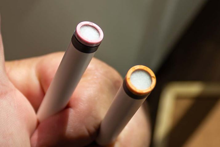 「レモンティー・ゴールド・アロマ」(写真左)と、「ストロベリー・マンゴー・ピンク・クーラー」(写真右)は、ともに2018年12月3日より順次全国発売予定で、価格は490円(税込)。同時発売となるホワイトのスターターキットは入手できなかったので、従来機の本体にカートリッジを付けるとツートーンカラーになってしまった。白いほうが太く見えるとしたら、それは目の錯覚だ