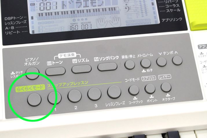 「ステップアップレッスン」の左にある「らくらくモード」ボタンを押すと、どの鍵盤を押さえても正しい音を鳴らしてくれるモードになります。つまり、ノリで適当に鍵盤を押せば楽曲が弾けるんです。まだ演奏に慣れていない段階でも、「とりあえず弾いてる感を楽しみたい!」という方にうってつけ