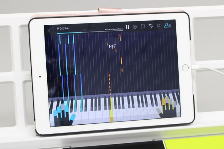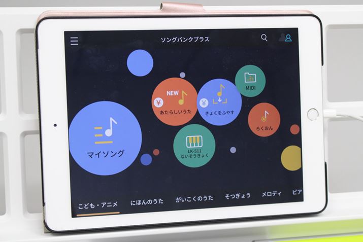 専用アプリ「ソングバンクプラス」をインストールしたスマホ/タブレットをLK-511に接続すると、いわゆる“音ゲー風”のアプリ画面にあわせてLK-511を弾けるようになるのです。文字で説明するより、画像と映像で見たほうが早いと思うので、詳細は以下をご覧ください。
