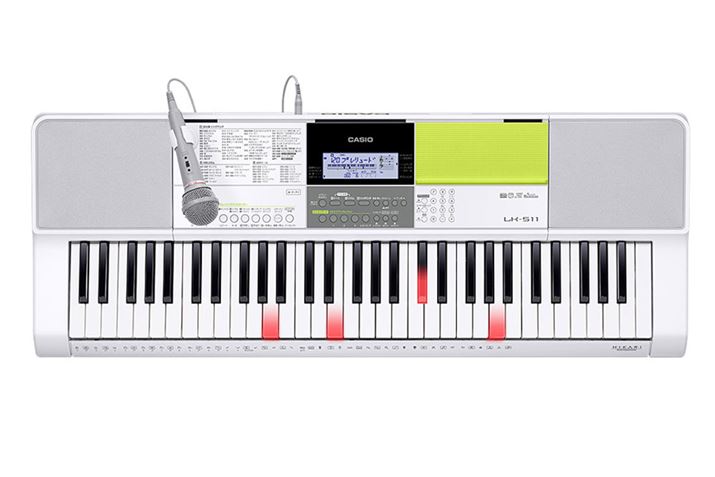 こちらが光ナビゲーションキーボード最新モデル「LK-511」。61鍵盤を備えるモデルで、同時発音数は最大48音、600音色をプリセットしています