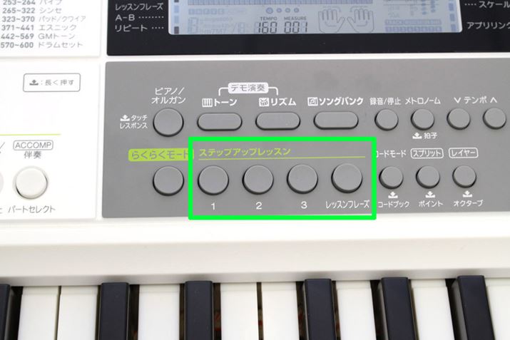 従来のレッスン機能も踏襲しており、3つのステップで練習できる「ステップアップレッスン」ボタンを搭載するのが特徴。演奏のグレードにあわせて3つのボタンを使い分けて、楽しく演奏練習できます。