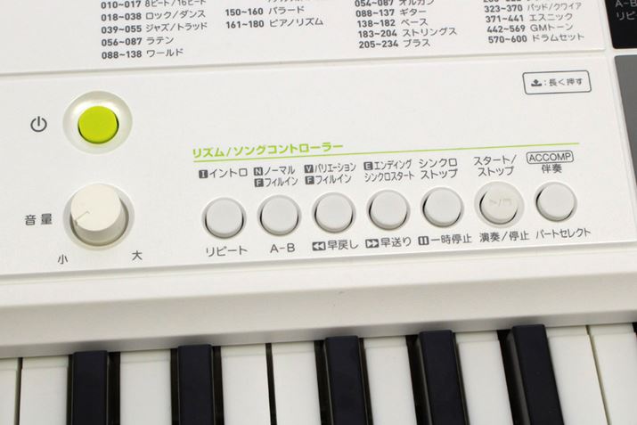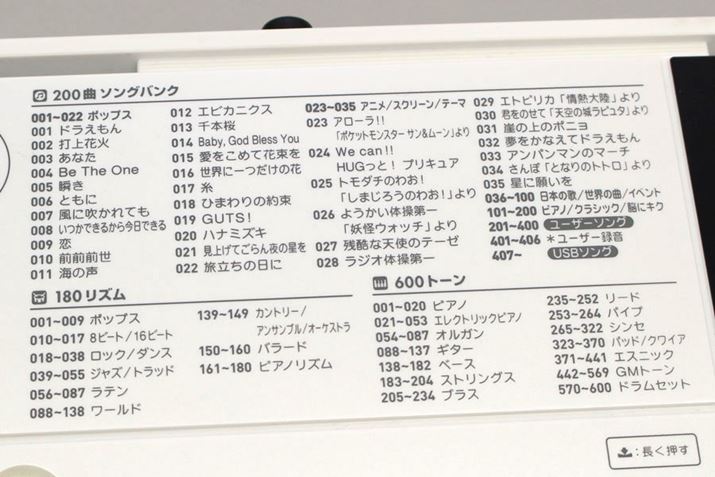 ディスプレイの左側には、代表的な内蔵曲一覧がプリントされています(ポップスからクラシックまで、内蔵曲数は200!)。その下には、音量調整ノブや内蔵曲の再生/停止ボタンなどが並びます