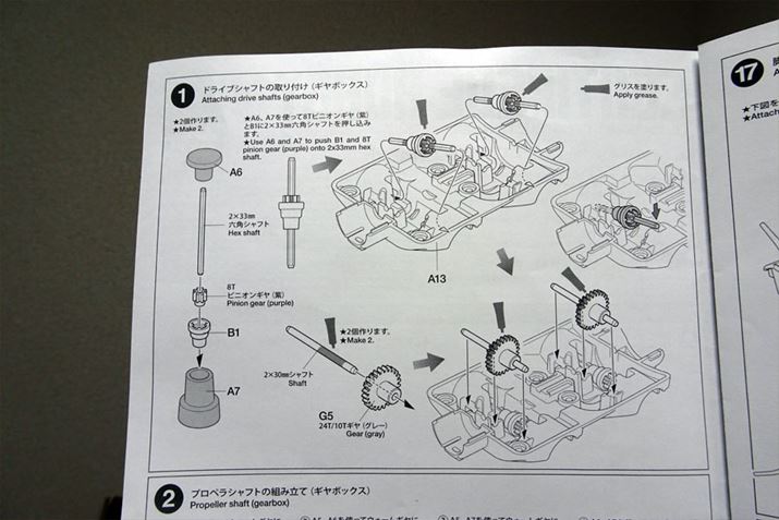 箱の雰囲気は、いかにもタミヤのプラモという感じ。必要な道具はニッパーとドライバー類。各部を潤滑させるグリスは余分にあったほうがいいでしょう