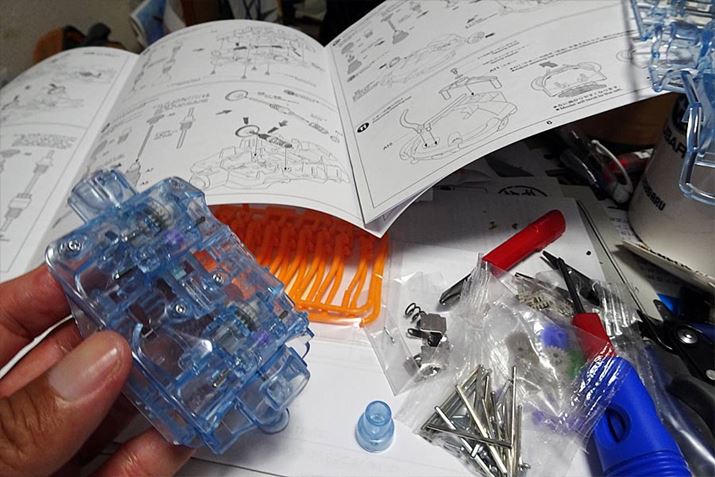 「ネジ止めとはめ込みだけで手軽に組み立て可能」とあるとおり、組み立て自体の難易度は高くはありませんが、かなりていねいに組み立てないと各部のフリクション(抵抗)が増すなどして動きが悪くなるので、その意味では組み立て難易度は低くないといえます。小学生の場合は大人の手助けや指導が必要でしょう。