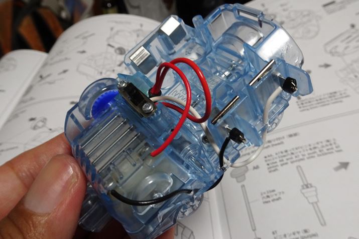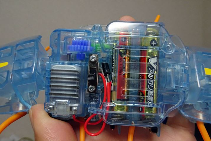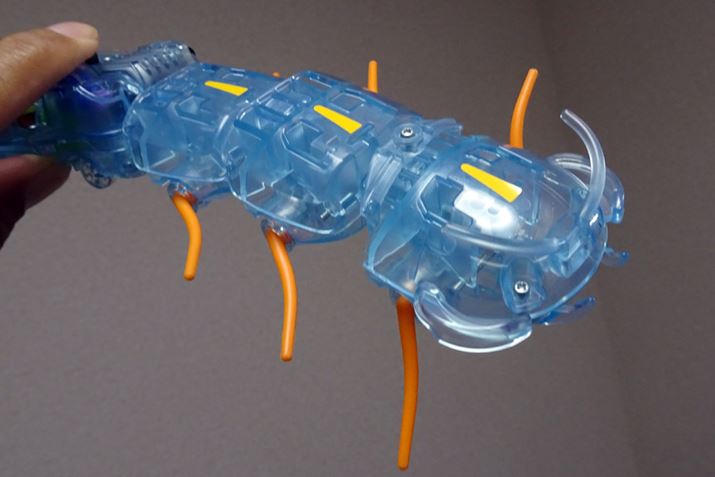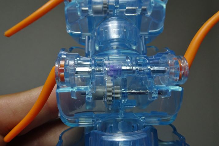 各ユニットや頭部のパーツはクリヤーブルーの成形色。モーターの動力がすべての胴体に伝わる巧みな構造に感心させられます。クルマのラジコンに通じる部分も