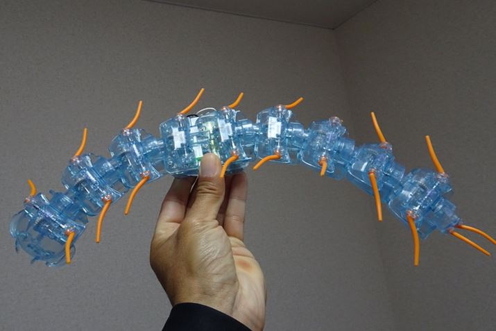プラモデルやラジコンの要領で組み立てると、ムカデの体の構造を再現したムカデロボットが完成。センサーやAIが搭載されているわけではないのに、地形に合わせて自動的に進む方向を変えながら動く様子が観察できるというものです。