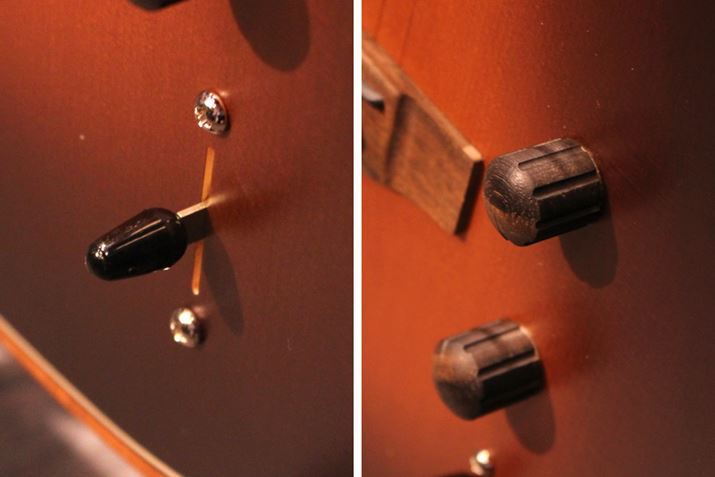 エレキギター風とアコギ風のサウンドを5段階で設定できるセレクター(左)と、音色を調整できるMODノブ(右 ※2つ付いているノブのうち、ひとつはMODノブで、もうひとつはボリュームノブ)