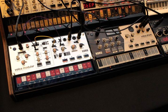 volca modular(左)とvolca drum(右)を組み合わせたところ。volca modularにはコルグのマシンと接続できるシンク端子も装備されており、ほかのvolcaシリーズなどとつないでシーケンサーを同期再生してセッションできる
