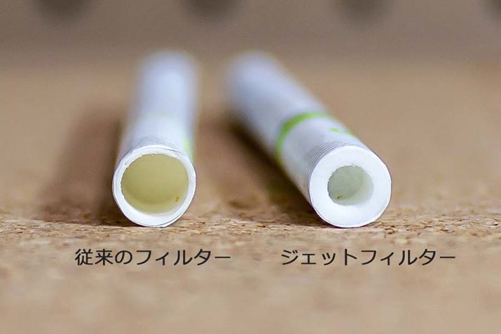 「グロー」のネオスティックは、2013年より紙巻きタバコの「ケント」で採用されているチューブのような形状の「ジェットフィルター」になり、煙が凝縮されることで味が濃厚になるという。左が従来のフィルター、右が新たに採用されたジェットフィルター