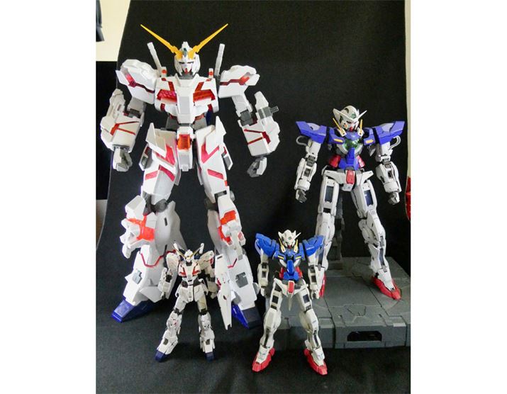 ほかのスケールとも並べてみました。左手前から「1/144 RGユニコーンガンダム」、「1/100 MGエクシア」、右奥が「1/60PGエクシア」。全高30cm超えのPGエクシアですら小さく見えます