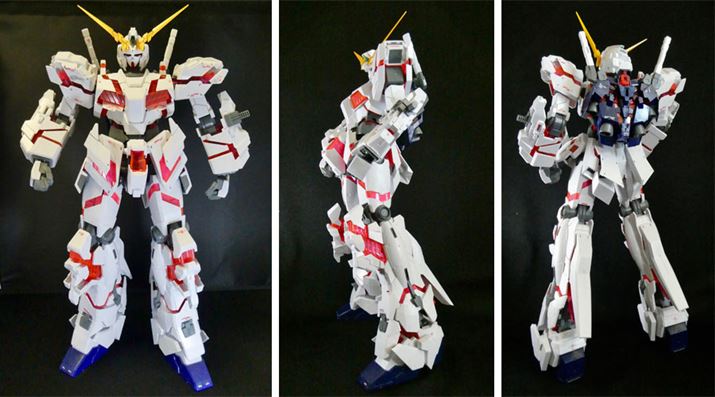 ぐるっと見ていきましょう。正面、サイド、バックショットです。巨大サイズながらしっかりとハイディテールな作り込みで、完成度がとても高いユニコーンガンダムだと思います