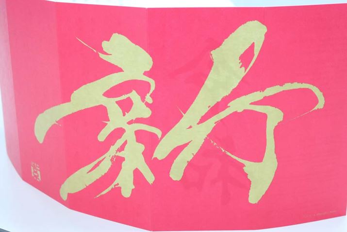 巻物をイメージした厚紙には、紫舟氏による「新」の書があしらわれている。躍動感がすごい! 「軽やかな風に乗って、元号が変わった新しい時代がやってくる」イメージだという