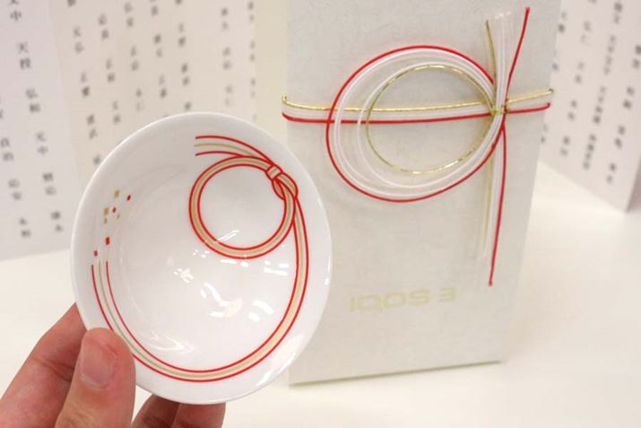 セットの盃には、オリジナル水引のデザインがあしらわれている。お酒を入れるほか、ヒートスティックを置くのにも使えるという