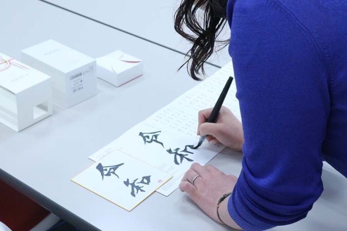 字が得意でない筆者に代わり、弊社の美文字社員が筆を取る。製品に同梱されていた紫舟氏の「令和」の書が印刷された色紙をお手本にしながらしたためてくれた