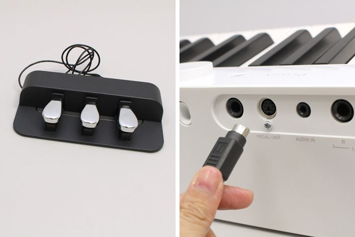 本体の背面端子部にペダル端子が装備され、3本ペダルユニットを直接接続できるようになりました。専用スタンドを使わず、好きな場所に置いてOK。実際に弾いてみた感じ、3本ペダルを接続したほうが断然いい演奏ができます