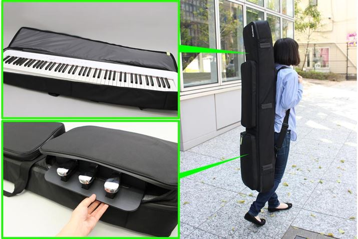 ちなみに専用のキャリングケースも用意されていて(別売)、背負って持ち運べます。もちろん大きいし軽いものではありませんが、楽器(しかもピアノ)と考えたらかなり楽に運ぶことができます。ポケットには3本ペダルや譜面台を入れられます
